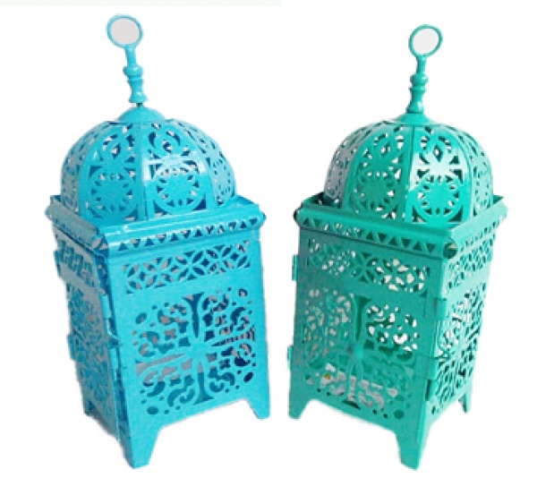 • Lote com 2 (duas) lanternas indianas de metal policromado e com belos vazados. Medida 10x10x17cm.