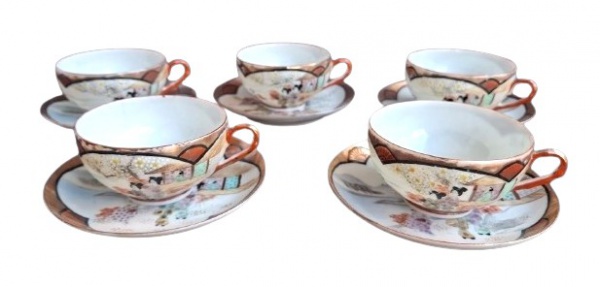 • Lote com cinco xícaras de chá em porcelana japonesa casca de ovo, com decoração oriental em tons ocre e dourado. Marca da manufatura no fundo. Uma apresentam trincado.
