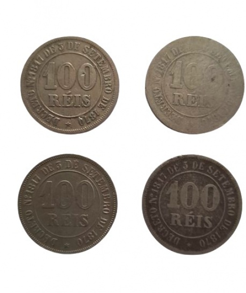 • Lote com 4 (quatro) moedas de 100 REIS de 1871, sendo uma com ano ilegível.