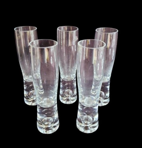 • Lote contendo 5 (cinco) copos para drink em cristal, diáfano e incolor, formato longo e tubular, base espessa decorada.