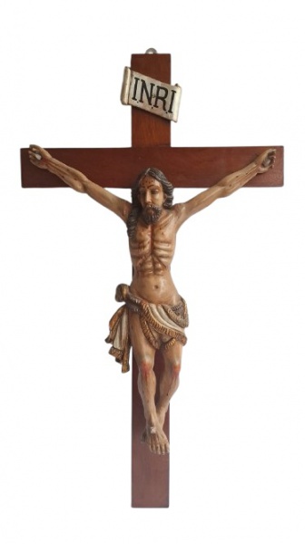 • Cristo Crucificado, imagem sacra em madeira, com ricos entalhes e belíssima policromia com detalhes em folha de ouro. Medidas 70x41cm.