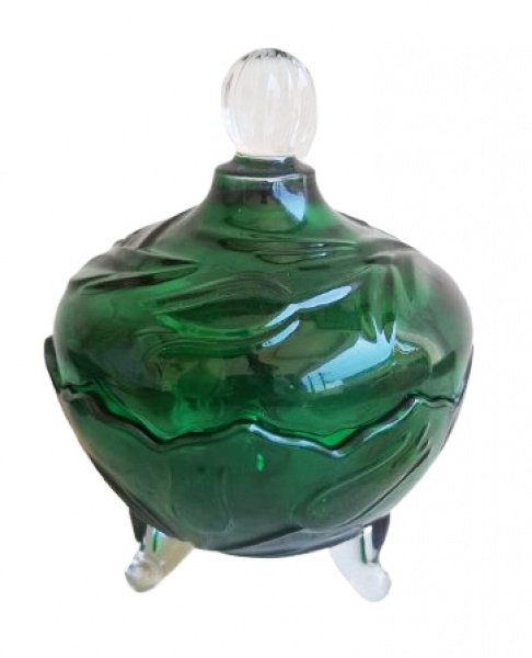 • Belo bomboniere em vidro prensado com lindos relevos e tampa com puxador em double color. Medida 14x19 cm de altura. Medidas 14x19cm.