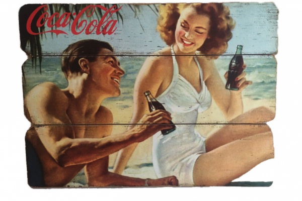 • Placa decorativa remetendo a antiga propaganda da Coca´Cola, confeccionada em similar de madeira. Medida 50x37cm.