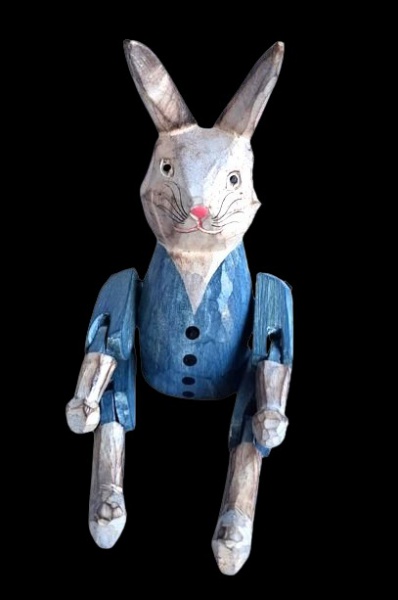 • Grande coelho articulado esculpido em bloco de madeira ricamente policromado. Medida 36cm