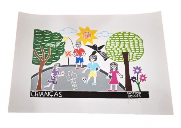 • GUSTAVO BORGES - Xilogravura a cores denominada "CRIANÇAS", assinada canto inferior direito. Medida 33X48cm. Sem moldura.