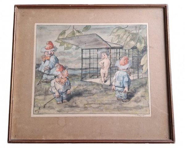 • ROBERT HÖGFELDT - Antiga, rara e original pintura aquarelada sobre cartão, assinada na parte direita inferior e emoldurada com proteção de vidro. Robert Högfeldt 1894/1986, nasceu na Holanda, pintor e cartunista com formação em Paris e na Suécia, suas obras são na maioria motivos de sátiras ao comportamento social da época. Possuindo obras até no Museu de Estocolmo - Suécia. Medida total com moldura 33x38cm.