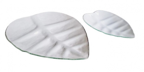 • Par de grandes centro de mesa em vidro, representado folhagem doble color. Medidas maior: 35x28cm e menor 24x18cm.