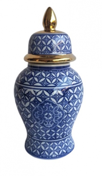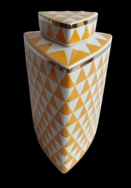• Porcelana oriental com rico colorido e decoração geométrica. Adornado com filetes ouro nas bordas. Medida 27 cm de altura.