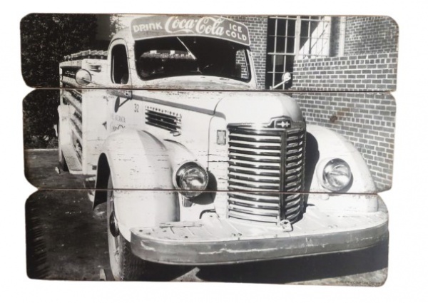 • Placa decorativa retrô com imagem de caminhão antigo de entrega da Coca-Cola, confeccionada em similar de madeira. Medida 50x37cm.