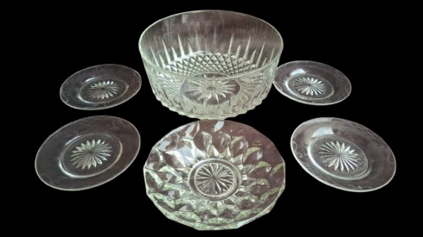 • Lote contendo cinco peças em cristal lapidado e uma de vidro lapidado. O Bowl 20cm, os pires 12cm e 15cm a petisqueira. O Bowl apresenta pequeno bicado.