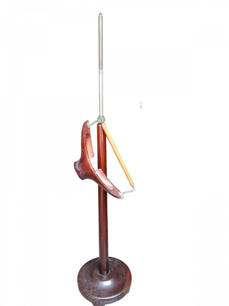 • Antigo cabideiro de pé em madeira nobre e metal. Medida 154cm de altura. Lote vendido no estado.
