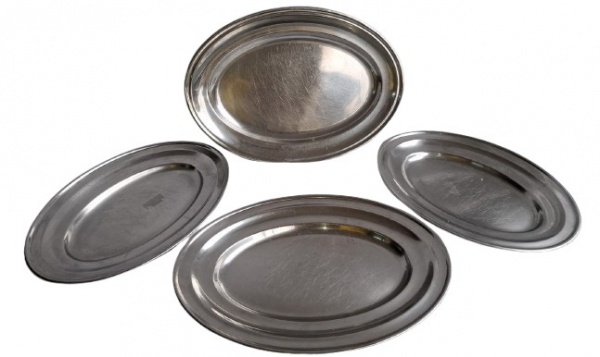 • Lote contendo 4 travessas em inox em formato tradicional. Apresenta marcas de uso. Medidas: O maior 42x30cm e o menor 37x26cm.