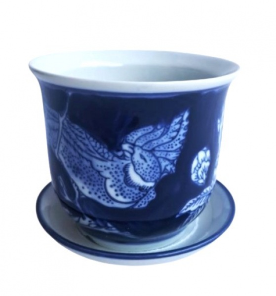 • Belíssimo cachepô em porcelana azul e branca, pintura de flores e pássaros. Acompanha prato de apoio, medindo 10cm de altura e 10 cm de diâmetro.