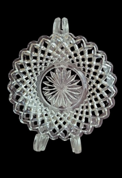 • Pequena fruteira em vidro geometrizada com fundo em dália. Medida 18 cm