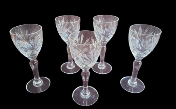 • Lote com 5 (cinco) taças de cristal para licor. Apresentam bicados na base.