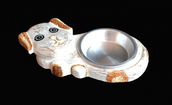 • Comedor para animal em bloco de madeira ricamente entalhado e policromado e com vasilha em alumínio. Medida 32x22cm.