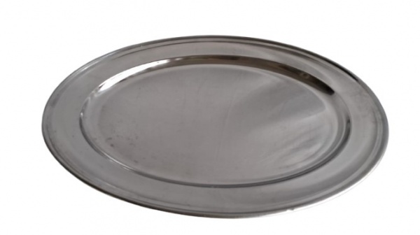 • FRANCALANZA. Grande travessa rasa , de forma oval, espessa , em inox e bordas simples. Apresenta marca de uso, sem interferir na função da peça. Medidas 56x41cm .