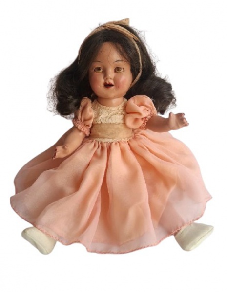 • Antiga boneca de massa, representando Shirley Temple, de 1940 , com cabelos cacheados e vestido rosa pêssego. Os olhos abrem e fecham. A boga é aberta. Apresenta uma pequena perda na íris do olho esquerdo. Medidas 33 cm. Lote vendido no estado.
