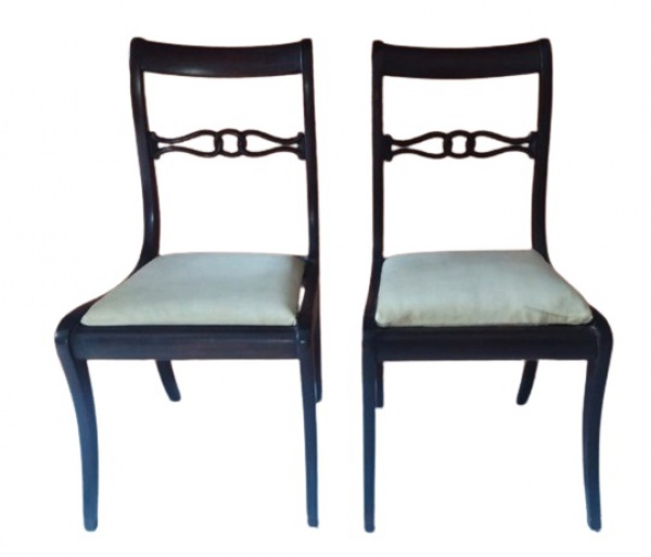 • Lote com 2 (duas) cadeiras em madeira nobre estilo regency com estofamento adaptado. Apresentam alguns desgastes. LOTE VENDIDO NO ESTADO.