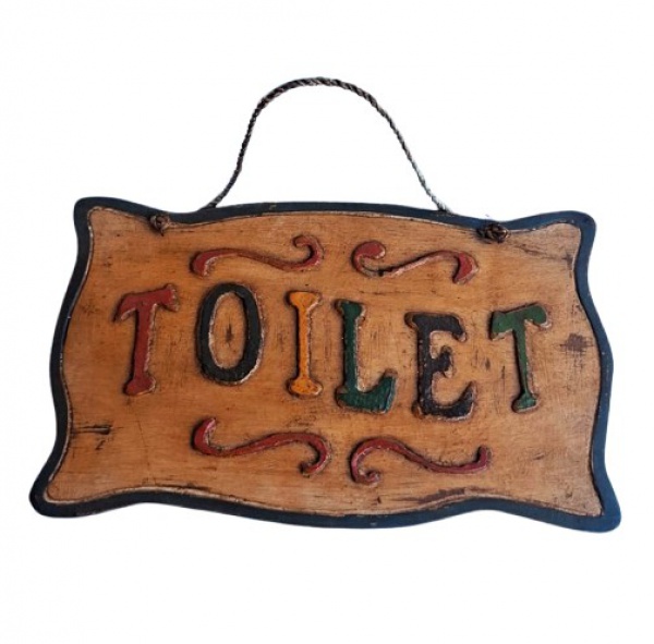 • Placa "TOILET" em madeira com relevos e policromada. Medida 22x14cm.