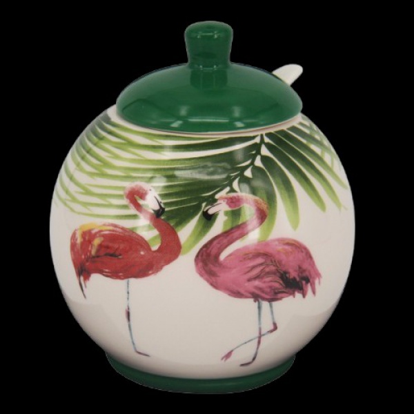 • Açucareiro de porcelana com tampa e figura de flamingos e folhagens.Medida 10x10x11,5cm. Acompanha colher de porcelana.