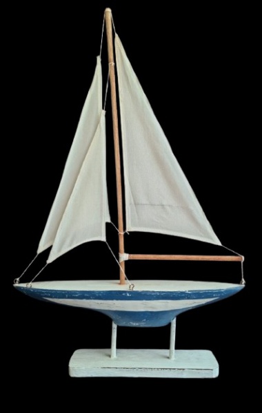 • Grande veleiro decorativo em bloco de madeira com velas de tecido. Medida 30x40cm.
